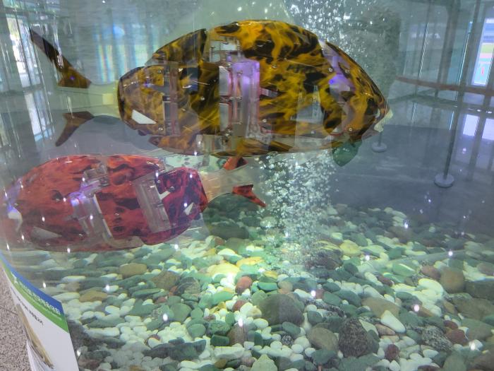 2018년에 비해 한층 업그레이된 모습으로 구미를 찾은 순수 국내기술 로봇물고기 미로는 시민운동장 주출입구 로비에서 육상경기를 위해 시민운동장을 찾은 선수, 임원들에게 볼거리를 선사했다.