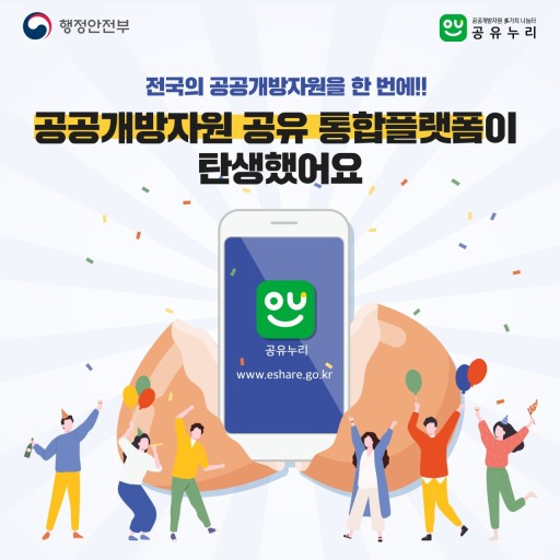 공유누리(www.eshare.go.kr)는 행정안전부가 구축한 공공개방자원 공유서비스 포털사이트로, 전국의 공공개방자원 정보를 쉽고 편리하게 검색·예약할 수 있는 공유 서비스이다.