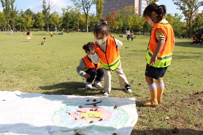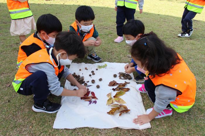 유아들은 바깥놀이터에서 놀이하면서 관심을 가지게 된 가을 동식물을 천년숲에서도 만날 수 있는지 찾아보며, 루페로 관찰하기도 하고 직접 찾은 도토리, 솔방울, 가을 열매, 나뭇잎 등을 가을 포토카드로 찍으며 가을의 아름다움을 찾아보았다. 수집해 온 자연물을 교실로 가져와 같은 색깔로 분류하기도 하며 팔찌 만들기, 얼굴 꾸미기 등 다양한 미술놀이를 하며 자연물데이를 즐기는 시간을 가졌다.