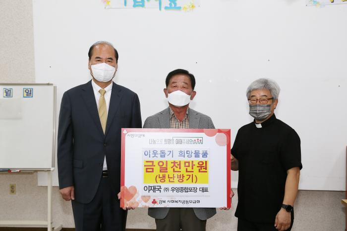 상주 출신인 이재국 (주)우영종합포장 대표가 15일 무료급식소 냉난방기 설치 비용으로 1천만원을 기탁했다.