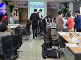연수에 참여한 선생님들은 실제 수업처럼 모둠을 구성하여 모둠을 구성하는 방법과 관계를 촉진하는 사회적 기술을 비롯해 이 사람을 찾아라, 시각 장애인 길 인도하기, 3단계 인터뷰, 생각 짝 나누기, 모서리 토론 등 다양한 협동수업 전략을 실습했다.