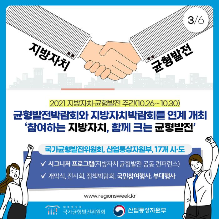 국가균형발전의 비전과 정책을 논의하고, 지역발전 성공사례를 공유‧소통하는 장인 ‘대한민국 균형발전박람회’는 2004년을 시작으로 해마다 열리는 국내 최대 규모의 지역박람회이다.