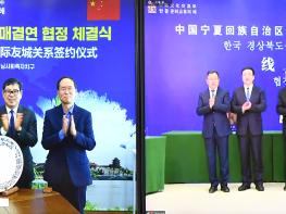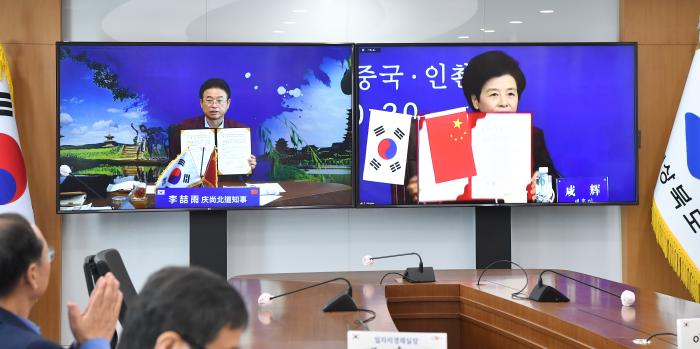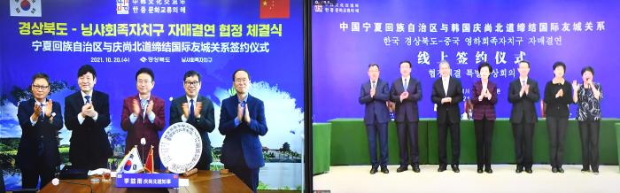 경상북도는 20일 중국 닝샤회족자치구(寧夏回族自治區) 시엔후이(咸輝) 주석과 함께 경북도와 닝샤 간 자매결연 협정 체결행사를 화상으로 개최했다.