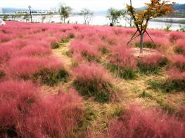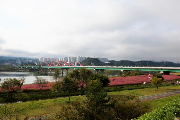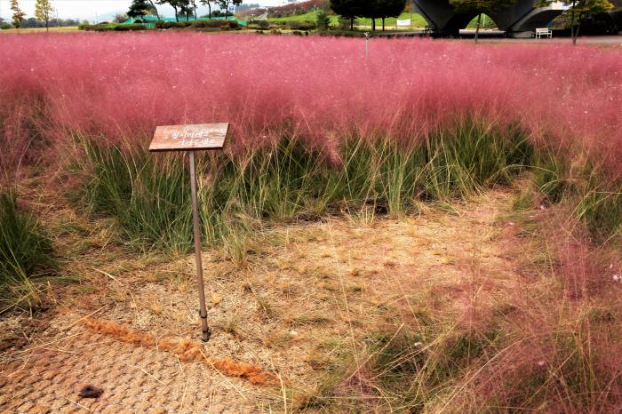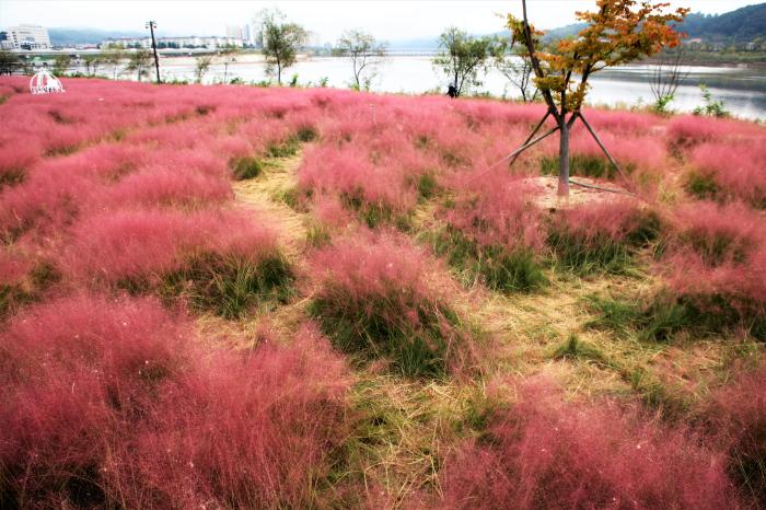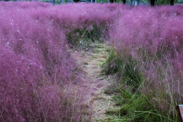 안동시 낙동강변 핑크뮬리꽃밭의 21일 오전 모습이다.