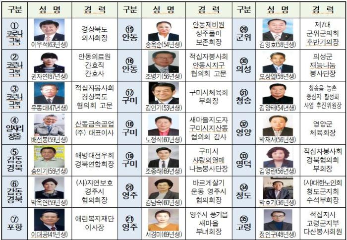 도민상 수상자는 경북도와 시군에서 추천한 후보자들에 대해 엄격한 현지 조사와 공적심사위원회의 심사를 거쳐 코로나19극복, 일자리 창출, 감동 경북, 지역사회발전 등의 부문에 총 42명을 최종 선정했다.