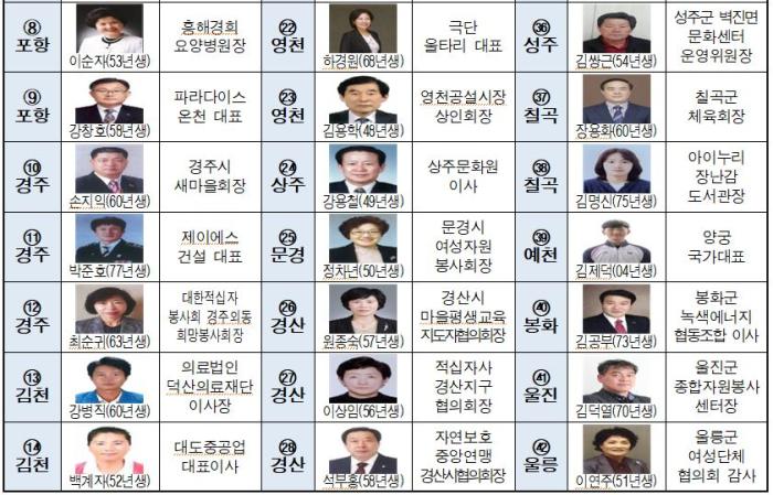 또한, 지난 도쿄올림픽 양궁 종목에서 2관왕을 차지해 지역을 알리고 국민들에게 꿈과 희망을 안겨준 예천군의 김제덕 선수를 비롯한 36명은 지역사회발전 부문에 수상자로 선정됐다.