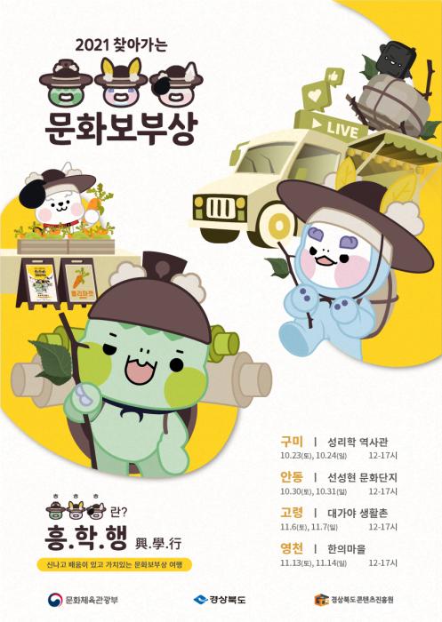 경상북도와 경북콘텐츠진흥원은 23일부터 내달 14일까지 4주간 매주 주말 구미 성리학 역사관을 시작으로 안동 선성현문화단지, 고령 대가야 생활촌, 영천 한의마을에서 ‘2021년 찾아가는 문화보부상을 운영한다.