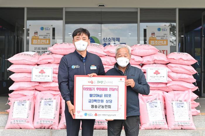 전국농민회총연맹청송군농민회(회장 오창록)가 관내 취약계층을 돕기 위해 22일 청송군을 방문해 310만원 상당의 유기농 통일쌀 60포(20kg)를 기부했다.