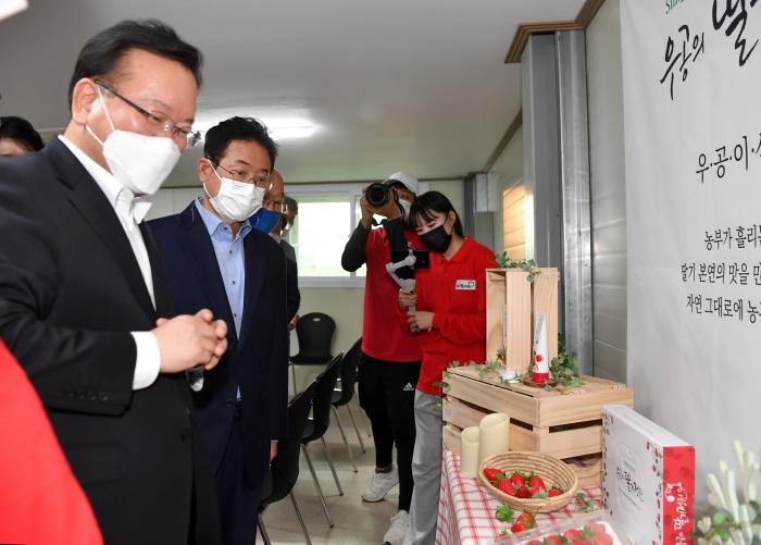 이어 상주 외서면에 소재한 우공의딸기를 방문해 청년농부들과 스탠딩 간담회를 개최하고 스마트 팜 활성화에 대한 다양한 의견을 나눴다.