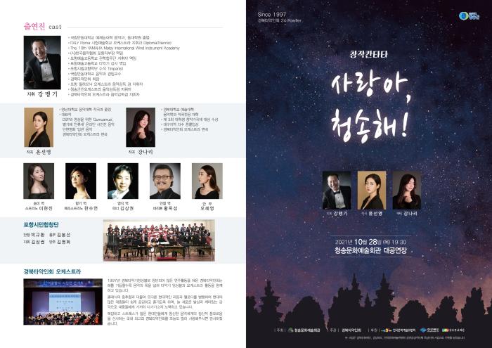 청송군(군수 윤경희)과 경북타악인회(대표 강맹기 교수)는 10월 28일 저녁 7시 30분 청송문화예술회관 대공연장에서 창작 칸타타 ‘사랑아, 청송해!’를 개최한다.