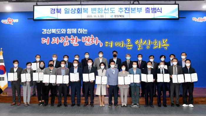 경상북도는 1일 오전 도청에서 정부의 ‘단계적 일상회복’시행에 발맞춰 민간위원을 포함한 ‘경상북도 일상회복‧변화선도 추진본부’를 출범하고 분야별 특화전략 수립을 위한 1차 대책회의를 개최했다.