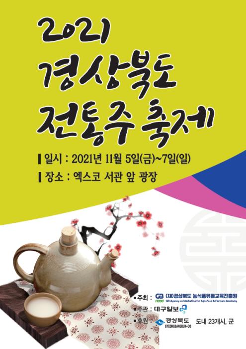 경상북도는 5일부터 7일까지 3일간 대구 엑스코 광장에서 지역의 다양한 전통주를 맛보고 체험할 수 있는 ‘2021 경북 전통주 축제’행사를 개최한다.