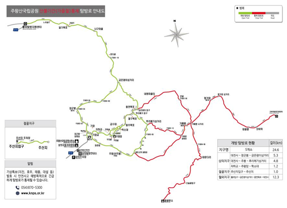 개방 및 통제 탐방로: 개방 5구간(24.6km), 통제 9구간(38.6km)