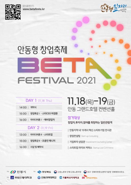 안동시와 안동대학교는 창업축제인 ‘BETA 페스티벌 2021’을 오는 18일부터 이틀간 안동 그랜드호텔에서 개최한다.