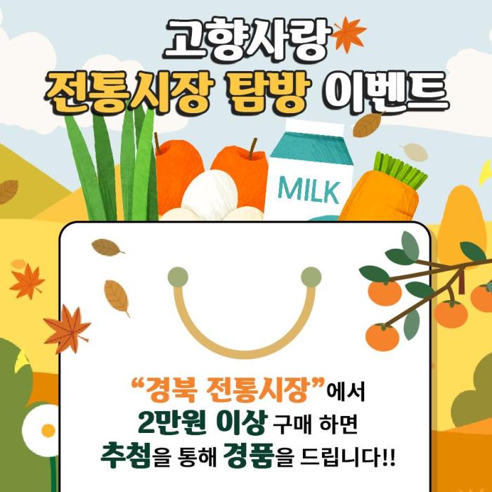 경상북도는 15일부터 지역에 있는 211개 전통시장과 상점가를 방문하여 2만 원 이상 소비한 방문객을 대상으로 ‘2차 고향사랑 전통시장 탐방 이벤트’를 시행한다.