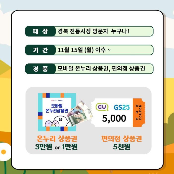 반드시 홈페이지에서 인증한 경북지역의 전통시장과 상점가에서 구매가 이루어져야 하며, 1인 1회에 한해 참여가 가능하다.
