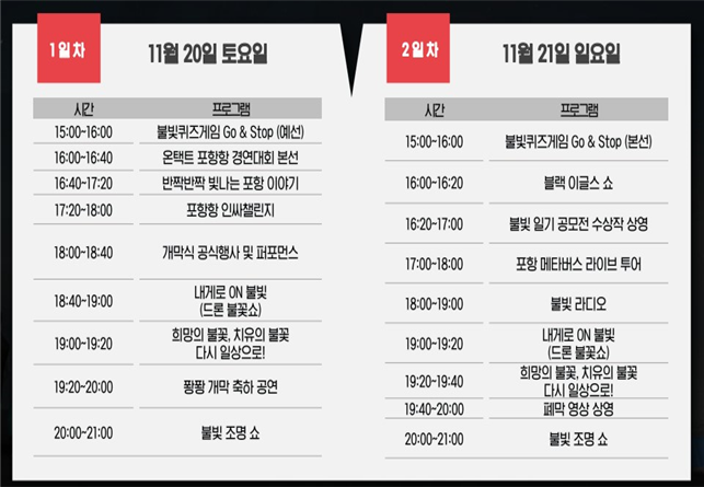 이 외에도 시민들의 사연을 수집해 상호 소통형태로 진행하는 보이는 불빛라디오, SNS를 통한 관람객 참여형 포항항_인싸챌린지, 온라인참여 챌린지, 지역경제 활성화를 위한 다양한 채널을 통한 라이브커머스 등 온라인을 활용한 볼거리와 콘텐츠들도 선보일 예정이다.