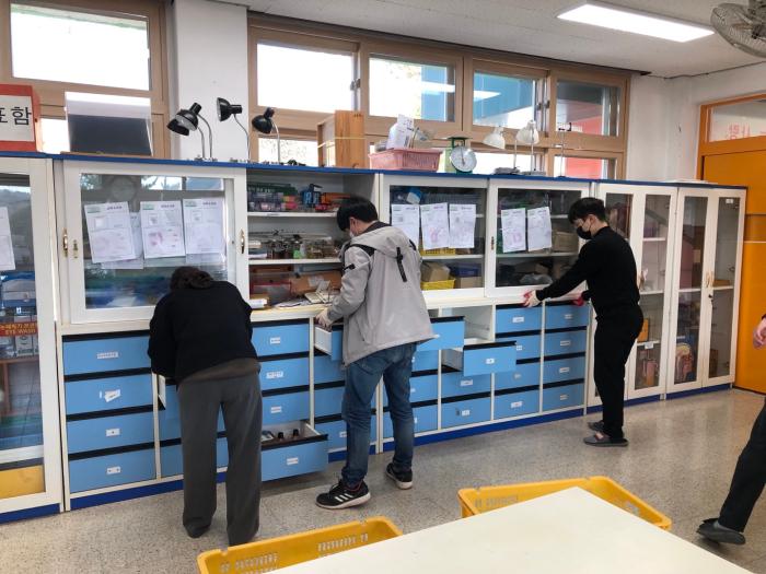 이번 과학실 환경정비 지원은 신청 학교의 과학 담당 교사와 지속적으로 협조하여 교육과정에 맞지 않거나 사용 기간이 지나 사용이 어려운 폐교구를 구분하고, 교구의 위치를 선정한 뒤 수량 점검 및 라벨링을 통해 목록화를 용이하게 할 수 있도록 정리했다. 또한 구분된 폐교구는 분리수거를 통해 폐기 업체가 즉시 처분할 수 있도록 지원했다.