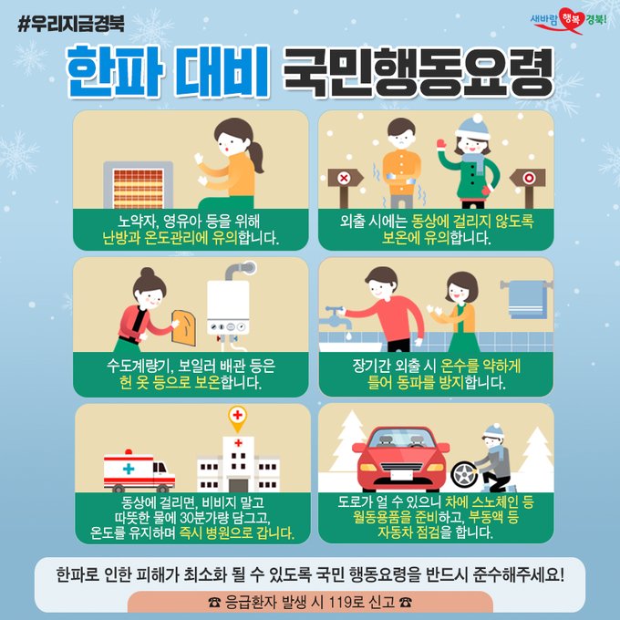 11월 22일(월) 21:00 이후 #경북 일부 지역에 #한파주의보 발효 갑작스런 추위로 큰 피해가 예상됩니다. 건강관리 및 시설관리에 유의하시기 바랍니다. 한파주의보 : 경상북도(경북북동산지, 울진평지, 영양평지, 봉화평지, 청도, 경주, 포항, 영덕, 청송, 의성, 안동, 군위)