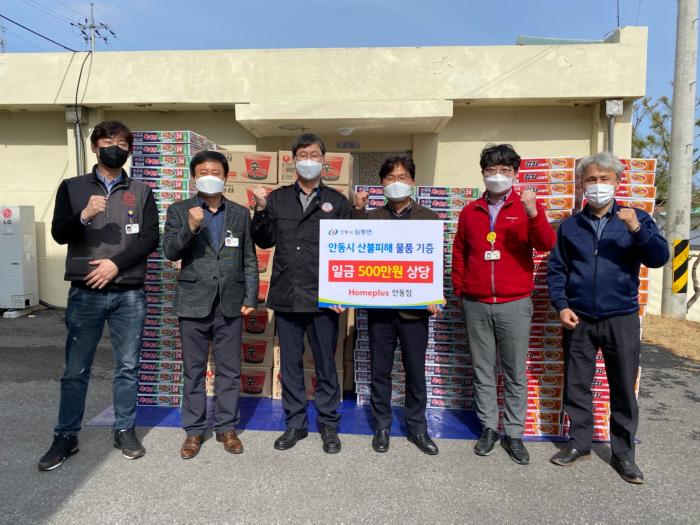 홈플러스 안동점(대표 박민규)에서는 3일 오후 500만 원 상당의 컵라면(농심 육개장 6입 400개, 김치 사발면 6입 400개, 신라면 큰사발 16입 95개)을 임동면행정복지센터에 전달했다.