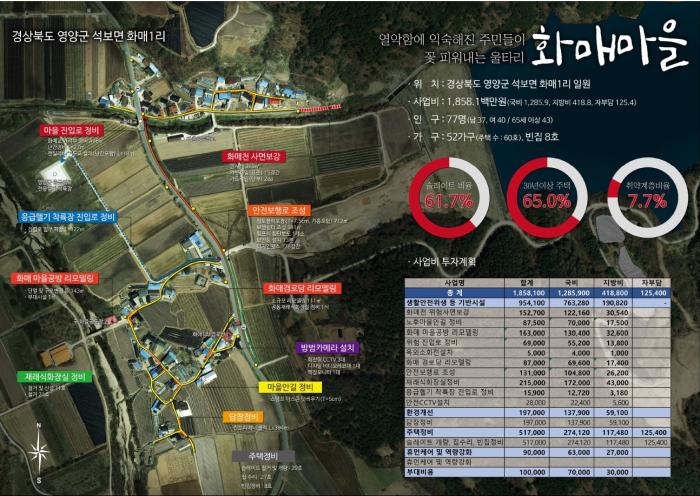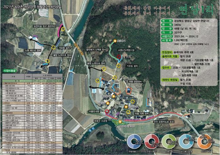 이에 영양군은 올해부터 2024년까지 4년간 총사업비 38억원(연당1리 지구 19억원, 화매1리 지구 19억원)을 투입하여 노후주택개량 및 마을 안길정비 등 생활위생지원사업, 안전확보를 위한 인프라 구축사업, 주민 역량 강화 지원사업 등을 추진할 예정이다.