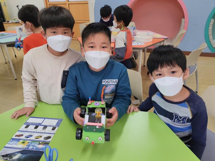 두 번째 활동으로는 빅북 교재를 통해 지구환경에 대한 경각심을 갖고친환경 에너지의 필요성과 원리를 이해하고 친환경 자동차를 만들어 보는 프로그램을 진행하였다. 나만의 친환경 자동차를 구상하고 직접 만들어보며 창의력과 협동심을 함양할 수 있는 시간이 되었다.