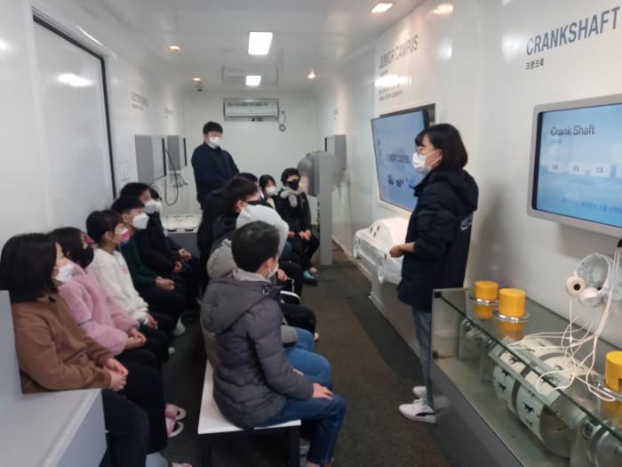 먼저 11.5톤 대형트럭을 개조한 모바일 주니어 캠퍼스 실험실에서 자동차의 안전장치, 동력 전달 장치의 에너지 전환, 제동장치의 마찰력 원리, 노면 진동 완화 장치의 원리, 무게중심에 따른 자동차의 안정성, 친환경 에너지와 전기자동차에 관해 다양한 기초과학 원리를 탐색하고 학습하는 시간을 가졌다.