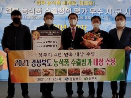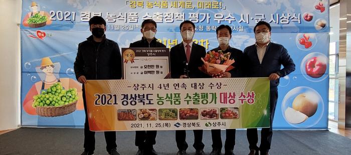 상주시는 11월 25일 경상북도에서 개최한 ‘2021년 농식품 수출정책 우수시·군 평가’ 시상식에서 ‘대상’을 수상하고 상사업비 5천만원을 받았다. 이 평가는 경상북도 19개 시·군을 대상으로 농식품 수출실적 및 증감률을 기반으로 수출 확대를 위한 시군의 노력과 관심도를 반영했다.