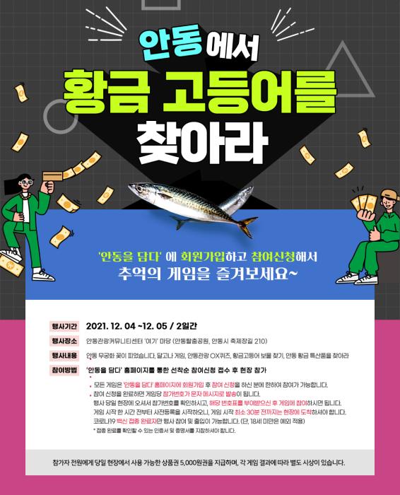 안동시관광협의회(회장 권혁대)는 통합관광 플랫폼 ‘안동을 담다’ (https://addmo.kr) 오픈을 기념하여 ‘안동에서 황금 고등어를 찾아라’ 이벤트를 진행한다.