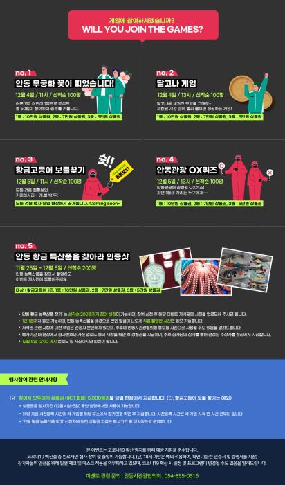 안동시관광협의회 관계자는 “추억의 게임을 즐기며 가족, 연인, 친구들과 힐링의 시간을 갖기를 바라며, 코로나19로 위축된 지역관광업계에도 도움이 되기를 바란다.”고 밝혔다.