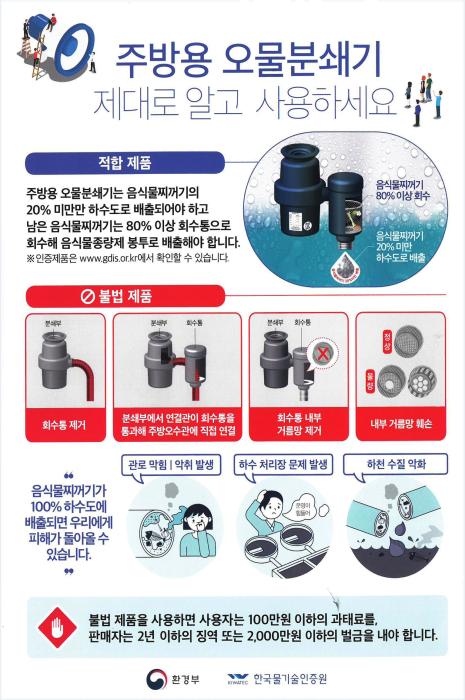 최근 주방용 오물분쇄기 사용이 많아지면서 일부 판매업체에서 인터넷 쇼핑몰과 홍보용 전단지를 통해 자신들의 제품이 마치 인증 받은 제품인 것처럼 허위로 광고한 뒤 판매하여 위법 사례를 양산하고 있을 뿐만 아니라, 불법 제품 사용으로 옥내 배수관이 막히고 오수가 집안으로 역류되어 악취가 발생하는 등 전국적으로 피해가 잇따르고 있다.