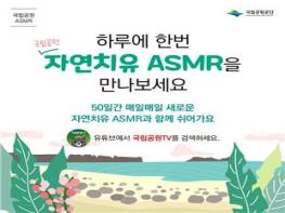 국립공원공단(이사장 송형근)은 코로나19 단계적 일상 회복에 맞춰 코로나로 지친 국민의 정서적 안정을 위해 12월 1일부터 50일간 매일매일 새로운 자연치유 소리영상(ASMR)을 국립공원 유튜브를 통해 온라인으로 제공한다고 밝혔다.