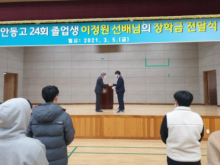 이정원(본교 24회) 졸업생은 “1970년대 자신의 가난한 고등학교 학창 시절 잘 사는 친구가 빵을 사 먹는 모습을 물끄러미 바라보며 남몰래 눈물을 흘렸는데 이 장학금으로 우리 후배들이 맛있는 빵을 사 먹으며 대학 입시 준비에 조금이나마 힘이 되었으면 좋겠다.”라고 말하였으며 앞으로도 후배들을 위해 계속 장학금을 전달할 계획이라고 전했다.