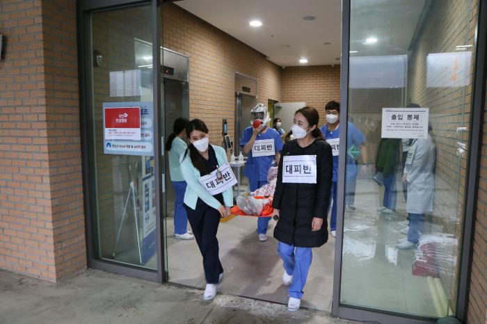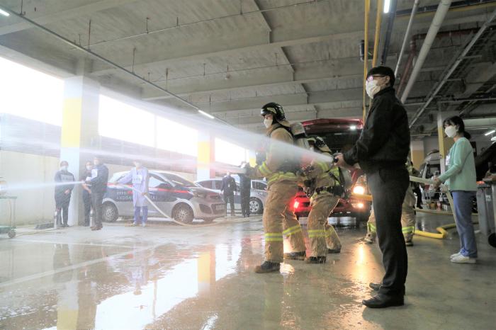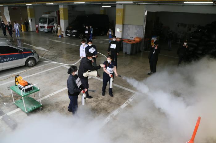 훈련에는 소방공무원 10명, 병원 관계자 50여명이 참여한 가운데 안동병원 별관 지하 1층에서 화재가 발생한 것을 가정 ▲119 화재신고 ▲병원 자위소방대의 초기 화재진압 ▲환자 등 인명대피 ▲중요물품 반출 ▲소방서 및 병원 합동 화재진압 ▲훈련 평가 및 간담회 순으로 진행됐다.