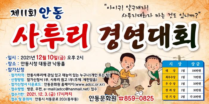 안동문화원(원장 이동수)은 제11회 '안동사투리경연대회'를 12월 10일(금) 오후 2시부터 안동시청 대동관 낙동홀(안동시민회관 대공연장)에서 개최한다.