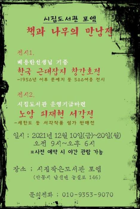 전시회는 오는 12월 10일(금)~20일(월) 10일간 오전 9시~오후 6시까지 자신의 시집작은도서관 포엠(안동시 남선면 놉실로 146. 안내/010.9353.9070)에서 배용한 선생님이 기증한 '한국근대잡지 창간호전'으로 1950년 이후 문예지 등 500여종이 전시된다.