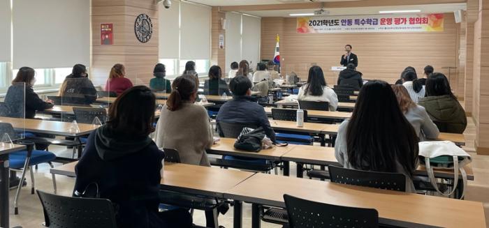 경상북도안동교육지원청(교육장 김동욱)은 12월 6일(월)에 안동특수교육지원센터에서 안동 관내 특수학급(유·초·중·고) 교사 40여명을 대상으로 「2021학년도 안동 특수학급 운영 평가 협의회」를 개최했다.
