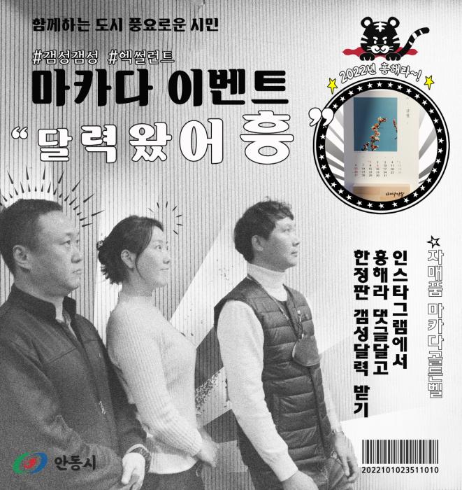 "갬성갬성 달력왔어흥"이벤트는 코시국으로 지친 서로를 격려하고 2022 힘찬 호랑이 기운으로 모두가 ‘흥’하길 기원하는 주제로, 이벤트 게시물에 새해 소원을 담아 ‘OOO 흥하라’문구를 포함한 댓글을 달면 선정을 통해 안동시 SNS 홍보팀에서 제작한 2022년 마카다 안동 한정판 달력을 증정한다.