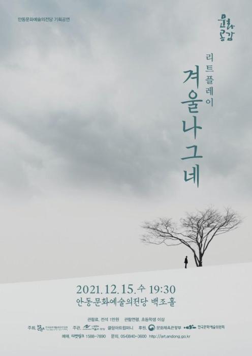 ‘2021년 문예회관과 함께하는 방방곡곡 문화공감사업 – 민간예술단체 우수공연프로그램 – 리트 플레이 겨울나그네’공연이 15일 저녁 7시 30분 안동문화예술의전당 백조홀에서 진행된다.