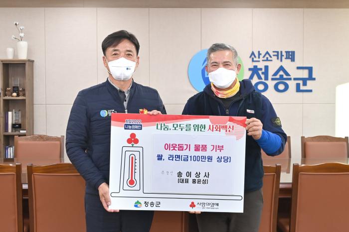 윤경희 청송군수는 “어려운 이웃들에게 따뜻한 마음을 내고 실천해 준 홍윤성 대표께 감사드리며 이런 훈훈한 정이 계속해서 이어지길 바란다.”고 전했다.(업무부서/희망복지지원담당 054-870-6178)