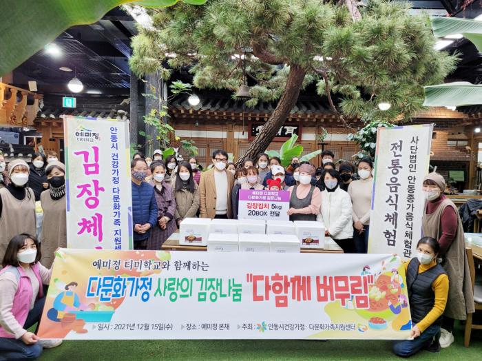행사를 주관한 안동시건강가정⋅다문화가족지원센터 유하영 센터장은 “코로나19로 센터 방문이 어려웠던 결혼이주여성들이 오랜만에 함께 모여 김장김치를 담그며 서로의 안부를 물을 수 있어 보람있었고, 소외된 다문화가정을 위해 김장김치를 후원해준 예미정 디미학교에도 감사의 인사를 전한다.”며 내년에도 더 많은 다문화가정이 맛있는 김장김치를 맛보고 나눌 수 있는 기회를 제공하겠다고 전했다. (업무부서/여성가족팀 054-840-6216)