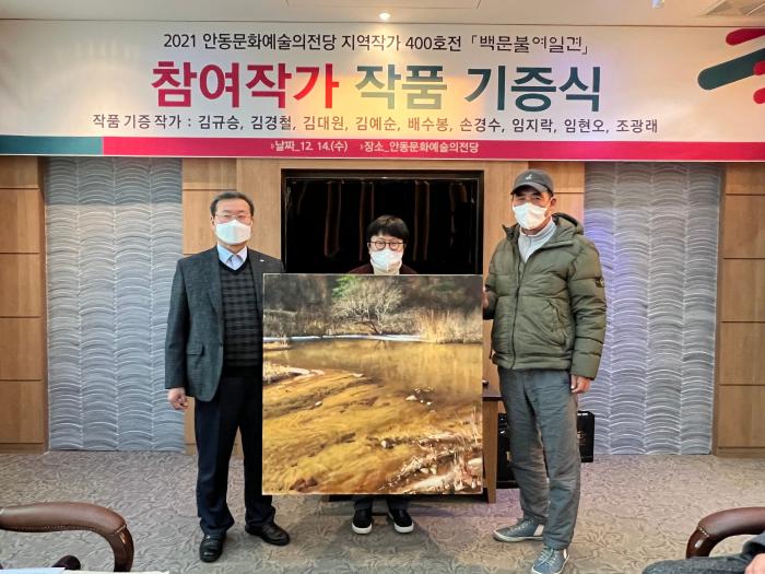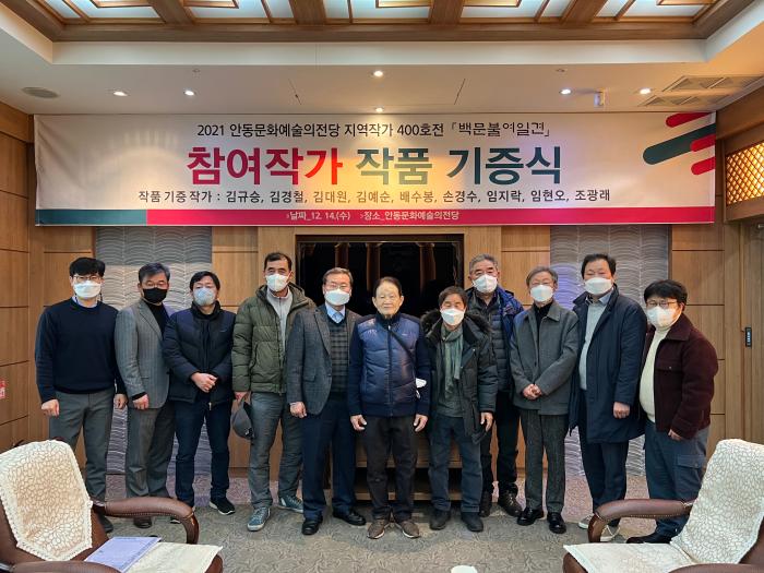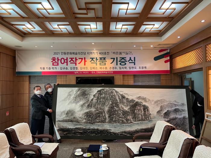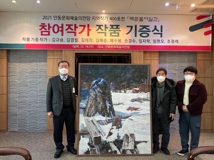 안동문화예술의전당에서 지난 8월까지 열린 지역작가 400호 특별기획전「백문불여일견:百聞不如一見」 전시를 마친 작가들이 본인의 작품을 전당 갤러리 활성화 및 지역예술인들의 지속적인 발전과 지원을 위하여 안동문화예술의전당에 기증하기로 했다.