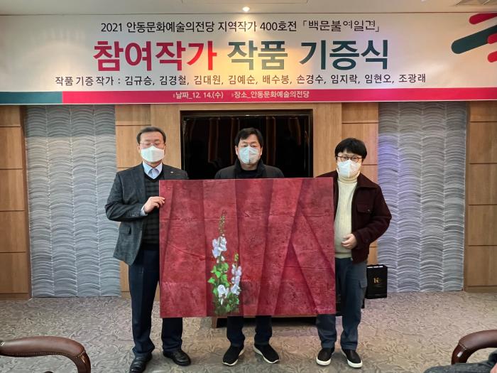 기증식은 12월 15일 11시 안동문화예술의전당 VIP실에서 개최했으며, 김규승 작가, 김경철 작가, 김대원 작가, 김예순 작가, 배수봉 작가, 손경수 작가, 임지락 작가, 조광래 작가 등 총 9명의 작품이다.