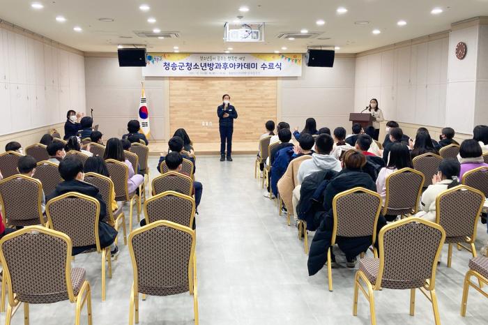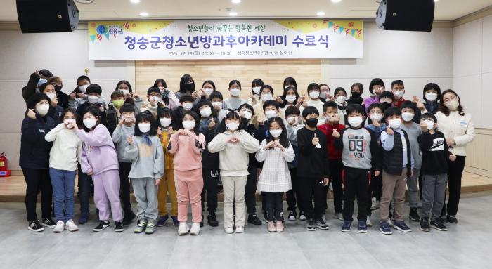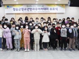 청송군 청소년방과후아카데미는 지난 13일 청소년수련관 실내집회장에서 1년의 과정을 마무리하는 수료식을 가지고, 초등학교 저학년(2~3학년) 20명, 고학년(4~6학년) 25명 등 총 45명의 수료자를 배출했다.
