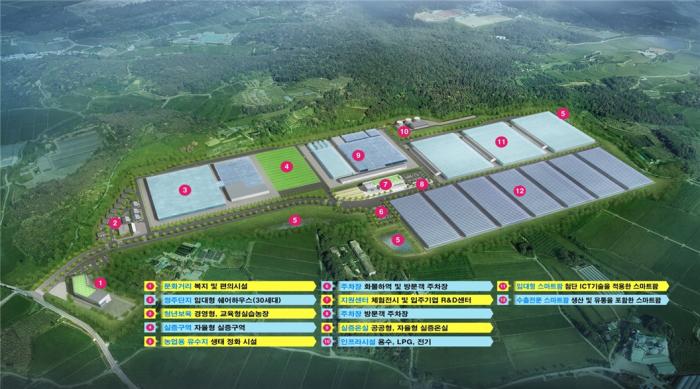 총 조성면적은 42.7ha(13만평)이며, 핵심시설로는 청년창업 보육시설 2.27ha(교육형온실 0.17, 경영형온실 1.91), 임대형 스마트팜 5.75ha, 실증온실 2.14ha 및 지원센터 0.45ha(2층, 연면적)로 구성됐다.