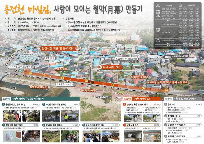 청송군은 지난 12월 16일 ‘용전천 마실길, 사람이 모이는 월막(月幕) 만들기’ 사업으로 국토교통부 주관 2022년 도시재생예비사업 공모에 최종 선정돼 국비 7천5백만원을 지원받게 됐다.