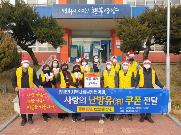 영양군 입암면지역사회보장협의체(공동위원장 정현석,김갑열)는 12월 21일 입암면행정복지센터 주차장 일원에서 저소득 취약계층 8가구에 난방유 200L(22만원 상당) 쿠폰을 지원하는 사업을 가졌다.