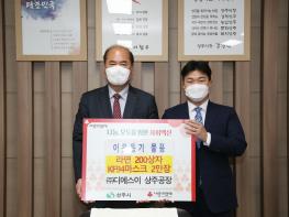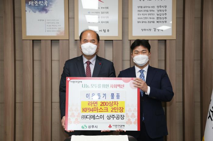 상주시 외답농공단지 입주기업인 ㈜디에스이 상주공장(공장장 박훈민)에서 올해 2월 2일 상주시에 덴탈마스크 5만장을 기탁한 데 이어, 12월 28일(화) 10시 경제적 어려움 및 코로나19감염에 취약한 저소득층을 위해, 라면 200상자와 KF94 마스크 2만장을 추가로 기탁하며 지역사랑 실천에 앞장서고 있다.