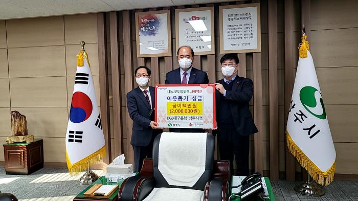대구은행 상주지점(지점장 권선일)은 2021년 12월 27일 연말에 소외된 불우이웃을 위한 지역 내 사랑 나눔 확산과 지역 기업의 사회적 책임 강화 차원에서 임직원 급여 1% 사랑 나눔 성금 200만원을 상주시청에 기탁하는 나눔 행사를 가졌다.