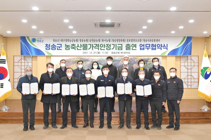 청송군은 지난 27일 군청 제1회실에서 7개 계통출하조직(대구경북능금농협, 청송농업협동조합, 남청송농업협동조합, 현서농업협동조합, 청송영양축산업협동조합, 진보엽연초생산협동조합, 청송사과유통센터)과 농축산물가격안정기금 출연을 위한 업무협약을 체결했다.
